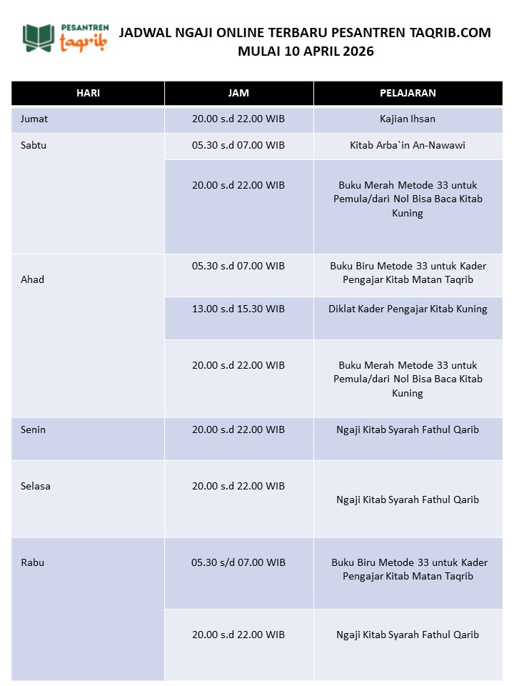 “Pesantrentaqrib.com membuka pengajiannya lagi mulai tanggal 10 April 2026. Pengajiannya ada yang daring atau online via zoom dan ada yang luring atau offline. Untuk online, ada penambahan materi dan perubahan jadwal,” ujar pengasuh Pesantrentaqrib.com, K.H. Rakhmad Zailani Kiki atau Kyai Kiki mewakili tim pengajar.